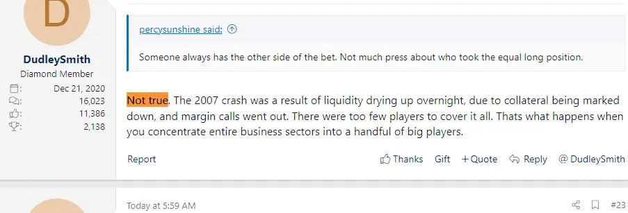 Not true. The 2007 crash was a result of liquidity drying up overnight, due to collateral being marked down, and margin calls went out. There were too few players to cover it all. Thats what happens when you concentrate entire business sectors into a handful of big players.