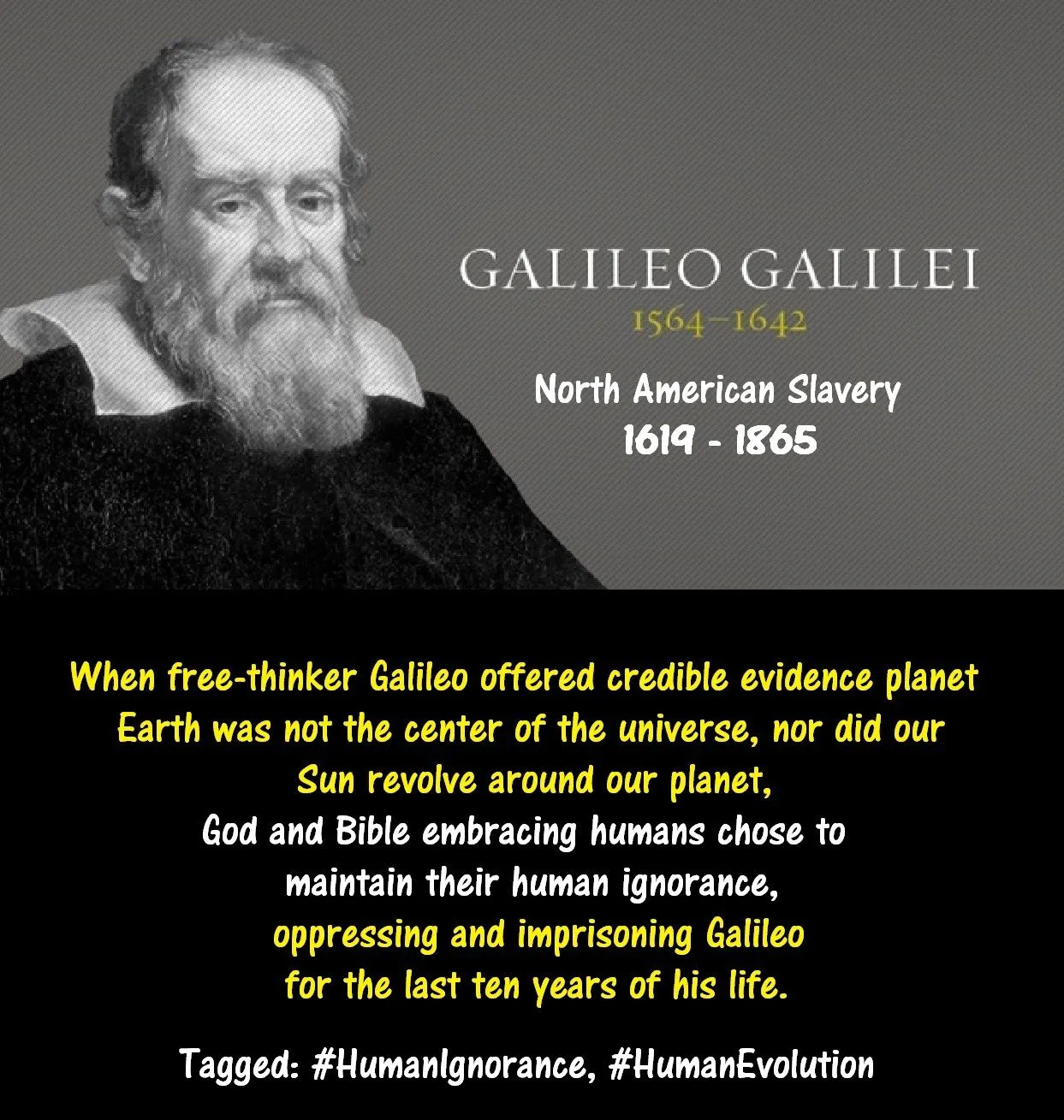When Galileo Galilei (1564–1642) an Italian astronomer, physicist, engineer, philosopher, and mathematician who played a major role in the scientific revolution of the seventeenth century offered evidence our Sun did not revolve around the Earth, a significant population of God and Bible embracing people CHOSE TO MAINTAIN their human ignorance by oppressing and imprisoning Free-Thinking Galileo for the remainder of his life.