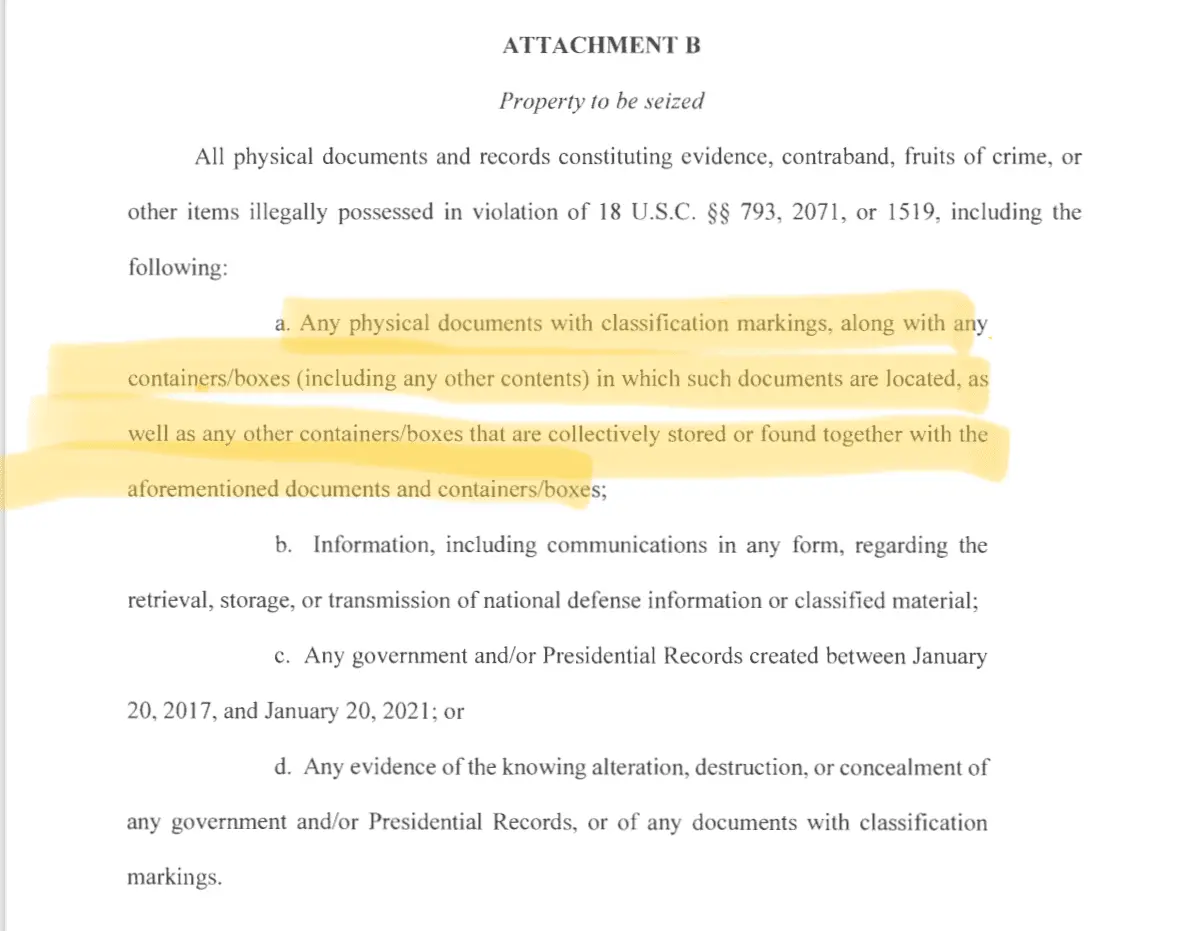 It’s not an overbroad search. In order to prove Trump knew he had documents, they can show that they were commingled with private effects. Therefore, the contents of the boxes is evidence of the crime.In the first place, that's an illegal overbroad search. In the second place, it still doesn't list his passport.