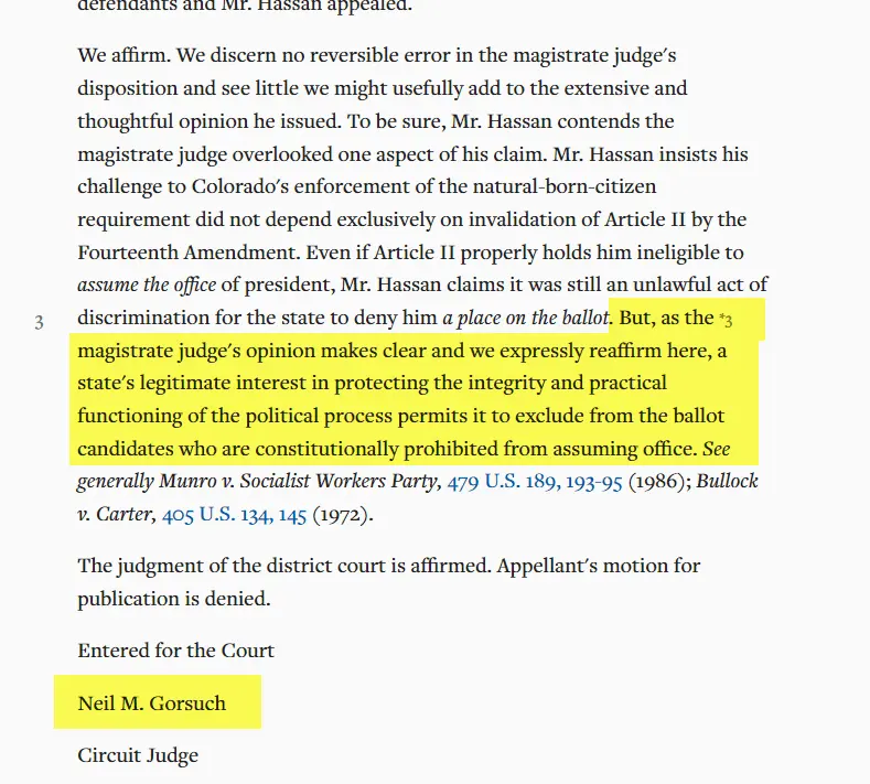 Of course it does, as Justice Gorsuch noted while on the 10th Circuit in the Hassen v. Colorado case. A state has a legitimate interest in protecting the integrity and process of elections to exclude candidates who are prohibited from holding the office.
