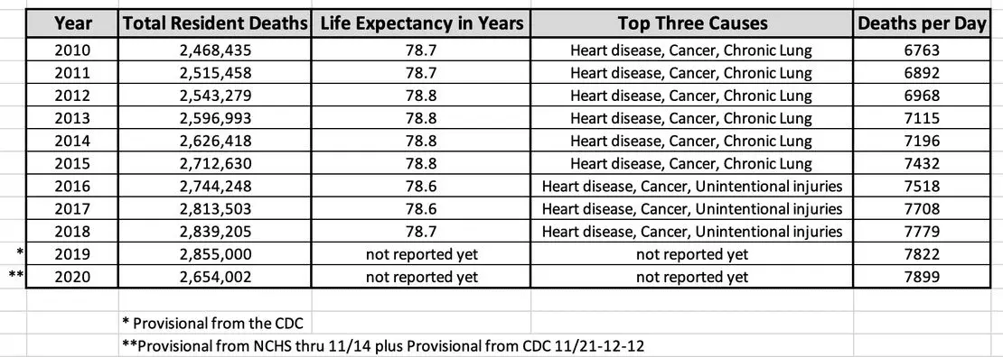 One would think in light of these dire predictions and given the horrible toll the response has taken on the economy and young people, the excess deaths due to COVID-19 would be through the roof. But federal data says that does not appear to be the case. The following chart shows annual deaths in the United States, life expectancy, top causes of death, and average deaths per day in the country. Data for 2020 is provisional through December 12th, and all data is taken from the CDC or the National Center for Health Statistics (NCHS):