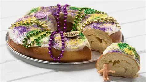 you are right!zebra, we , of course, eat "king cake" note the plastic baby in lower rigjht of the photo in case we continue. these things can be huge and filled with any kind of cream jelly etc. purple green and gold are the seasonal colors.