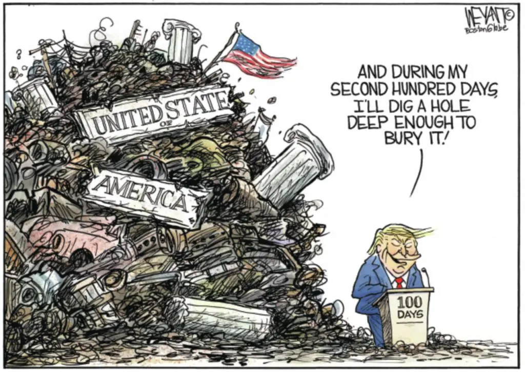 Trumps first 100 days in office have been an abysmal failure. There is no issue in which the American people agree with him on. Nobody is buying his lame excuses for the destruction of institutions, that nobody voted for. He is losing the trade war, the rest of the world has no respect for him, or fears him in the slightest. He has been reduced to buying support for his failed policies, and couldn't even sway what was a double digit lead by conservatives in Canada, in a stunning loss to the Liberals.