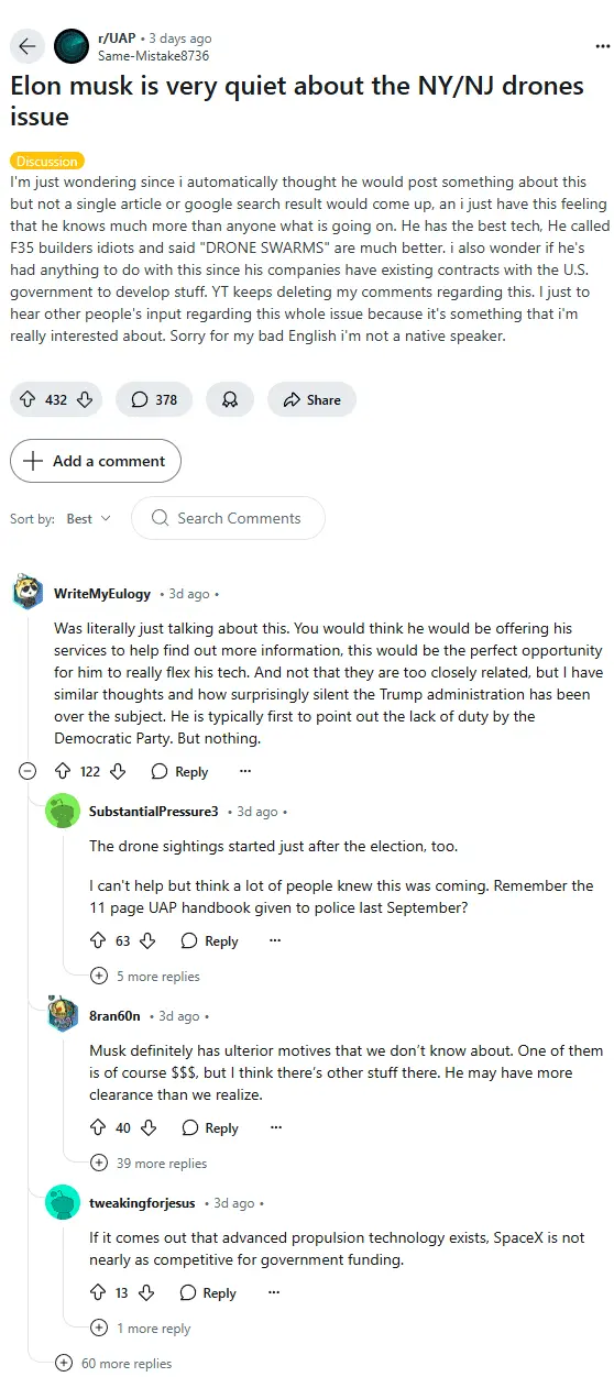 Isn't it odd how Mr Space himself - Elon Musk - hasn't said a damn thing about these NJ drones? surely this is a great opportunity to spout off and attack "woke liberals" for hiding stuff? for condemning the "deep state", but no, not a peep. This is the man who a few days ago suggested replacing F-35s with drones...