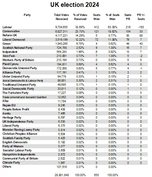 So I did a spreadsheet to see what the argument is all about. The column "Seats PR" is what each party would have won seats wise under Proportional Representation. The "PR +/- Seats" is what each party needs to lose or gain seats to conform to the likes of Austria, Sweden, Demark etc.. in fact, 74 countries.
