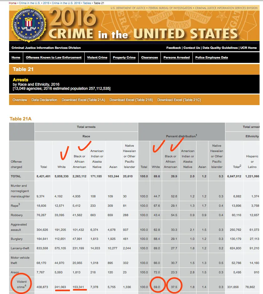 One of the Big Discrepancies is that the Federal stats lump 'Hispanic' in with White which makes the latter look higher.Explain why table 21A showing the percentage of people arrested for murder assigned to respective racial categories is vastly different from the distribution/percentage of murder offenders in table 2?