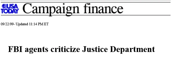 "In addition to partisan complaints from Republicans, columnists Charles Krauthammer, William Safire, and Morton Kondracke, as well as a number of FBI agents, suggested the investigations into the fundraising controversies were willfully impeded.[62][63][64]FBI agent Ivian Smith wrote a letter to FBI Director Freeh that expressed "a lack of confidence" in the Justice Department's attorneys regarding the fundraising investigation. He wrote: "I am convinced the team at... [the Department of Justice] leading this investigation is, at best, simply not up to the task... The impression left is the emphasis on how not to prosecute matters, not how to aggressively conduct investigations leading to prosecutions." Smith and three other FBI agents later testified before Congress in late 1999 that Justice Department prosecutors impeded their inquiry. FBI agent Daniel Wehr told Congress that the first head U.S. attorney in the investigation, Laura Ingersoll, told the agents they should "not pursue any matter related to solicitation of funds for access to the president. The reason given was, 'That's the way the American political process works.' I was scandalized by that," Wehr said. The four FBI agents also said that Ingersoll prevented them from executing search warrants to stop destruction of evidence and micromanaged the case beyond all reason.[65]
