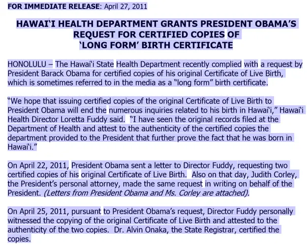 On April 27, 2011 President Barack Obama posted a certified copy of his original Certificate of Live Birth.