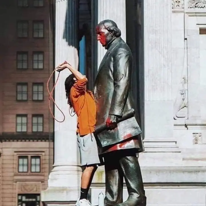 Below is a statue of Matthias Baldwin being defaced. In the early 1800’s he helped fund and build a school for black children way before most black kids were allowed an education. He was an abolitionist. He fought for black voting rights 30 years before slavery ended. Further proves my point that the Left know absolutely nothing about our country or just plain hate America.