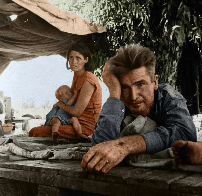 They are Ukranian; I bet. I know that look.A family of migrant workers fleeing from the drought in Oklahoma camp by the roadside in Blythe, Calif. 1936.