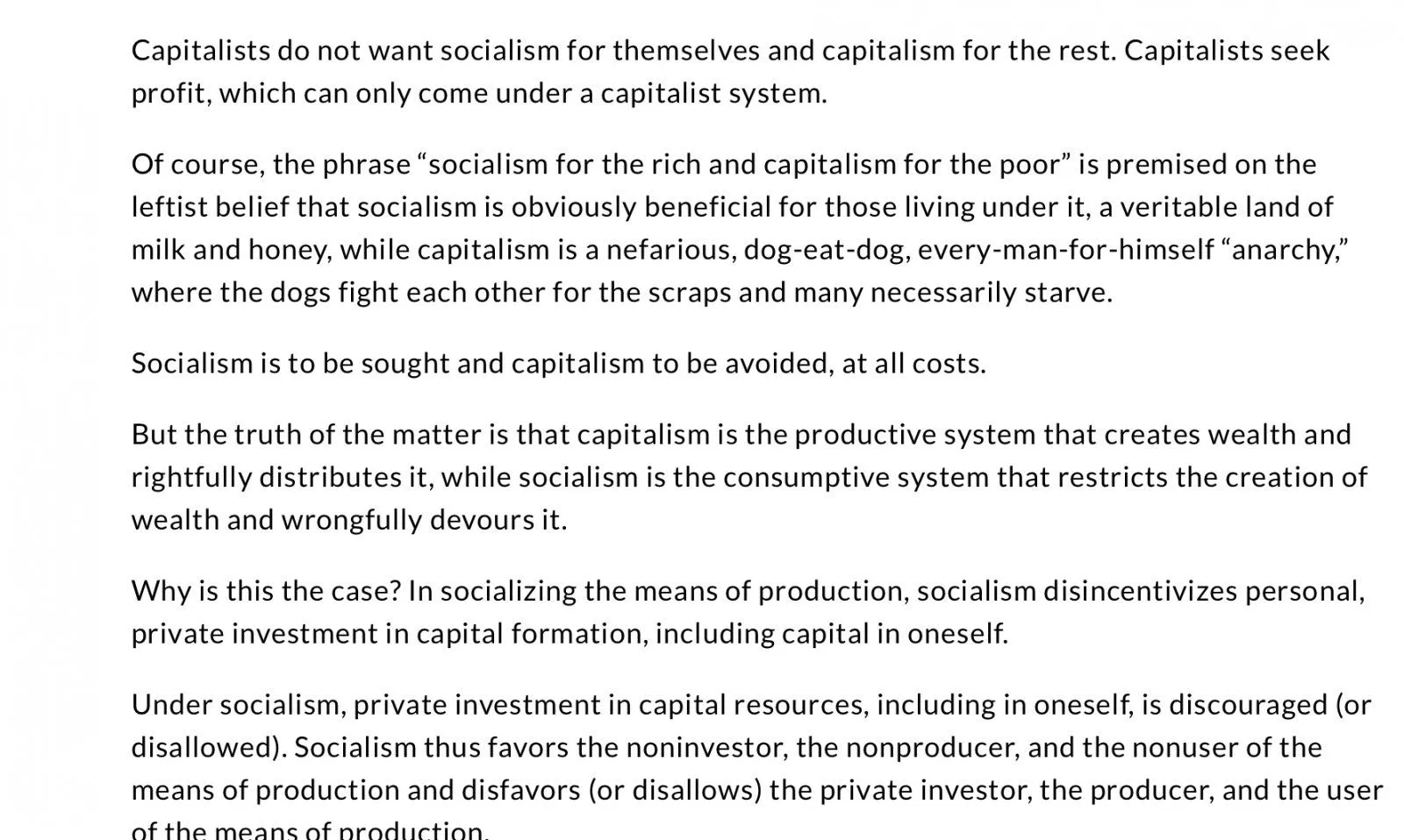 The standard leftist refrain about āadvanced capitalismā is that it amounts to āsocialism for the rich and capitalism for the poor.ā Like most leftist notions, this idea represents almost the exact opposite of the truth. The system they refer to is anything but socialism for the rich and capitalism for the poor. Capitalists do not want socialism for themselves and capitalism for the rest. Capitalists seek profit, which can only come under a capitalist system.