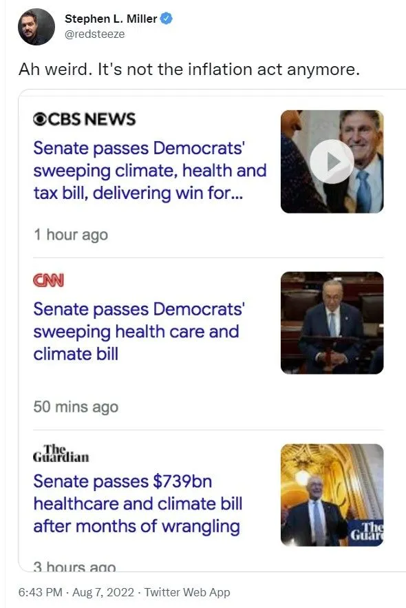 I suspect the media is just carrying the water again, "hey, focus on the words healthcare and climate so that we can help ourselves in the mid-terms, especially since we KNOW it won't improve inflation".