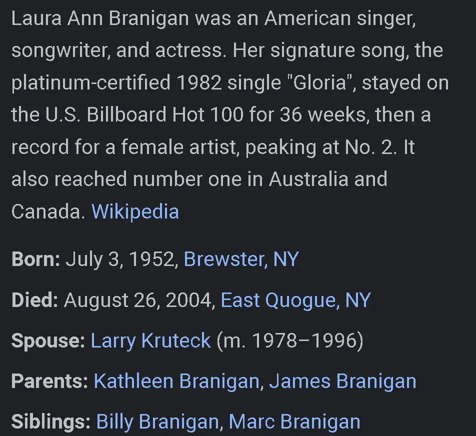 Laura Branigan, a singer whose high-volume vocals in the disco-style song ''Gloria'' propelled her into pop stardom, died in her sleep Thursday night at her home in East Quogue, N.Y. She was 47. The cause was a brain aneurysm, said her brother Mark Branigan.Aug 29, 2004