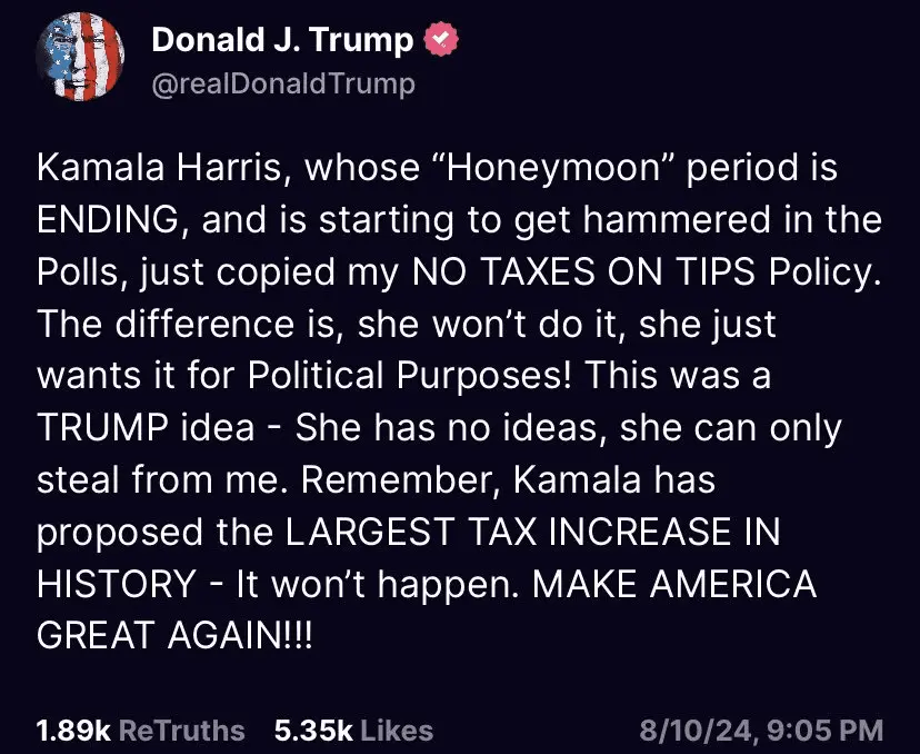 Can't make this up. Now the phony kamabla said at her underwhelmingly attended clown show in Vegas... is taking one of Trump's plans while being President for the "no tax on tips" to help the middle class. These crony demos just think the people are that stupid to fall for her bullshit!