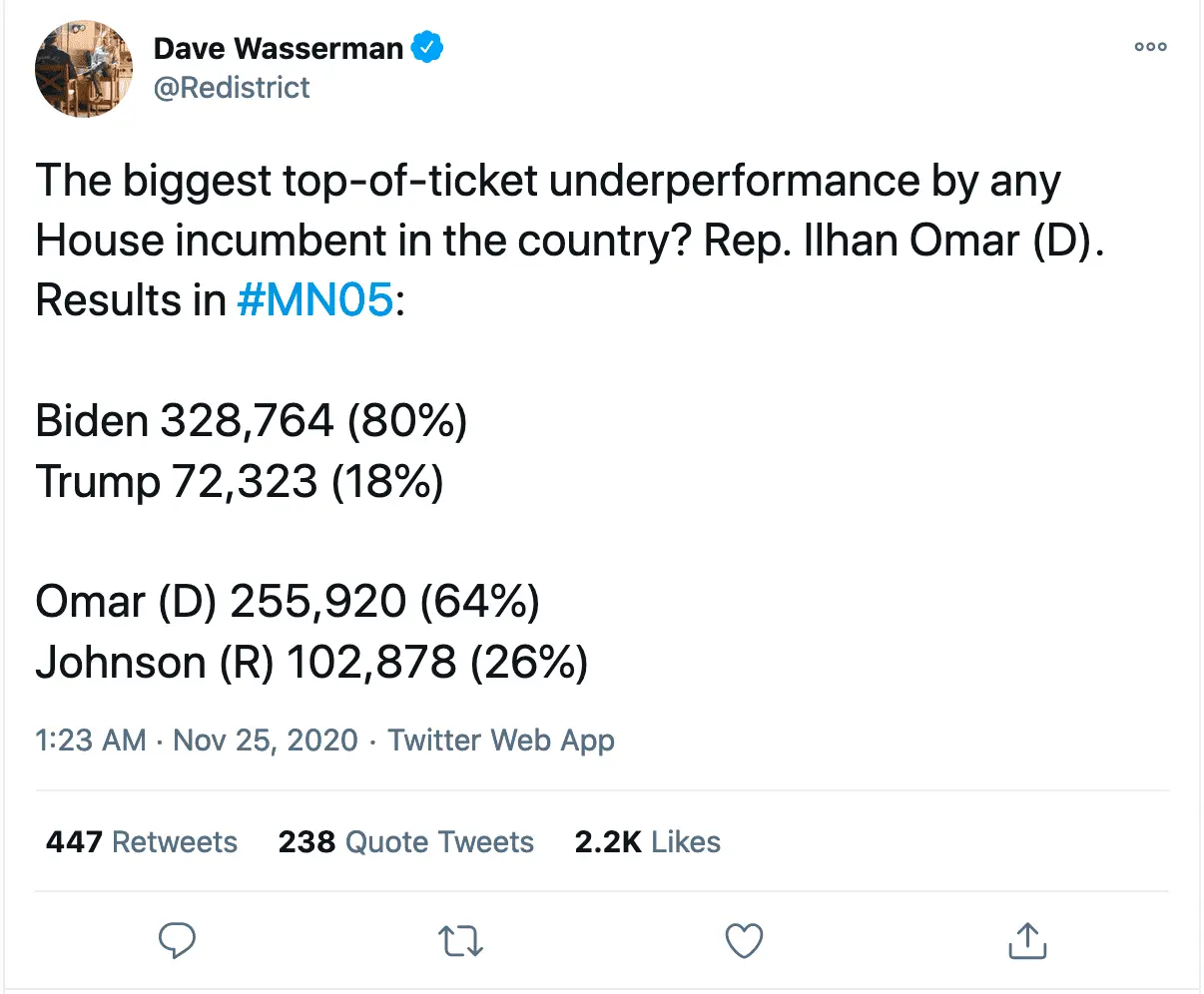 In House District MN05, Ilhan Omar's district, one of the most radical leftists in the House, underperformed the President-Elect by more than any other candidate in the country.