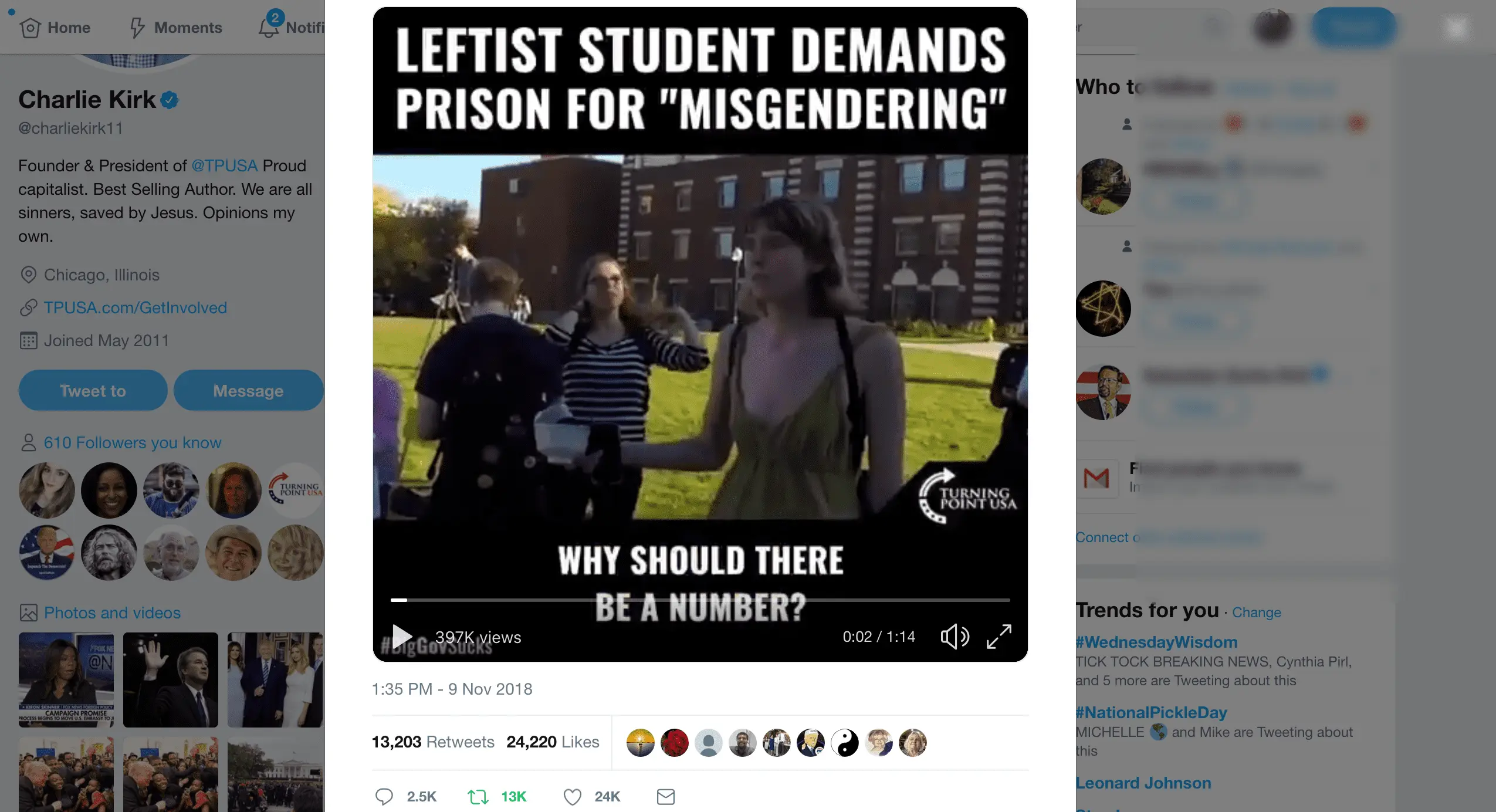 The left is perfectly fine with putting someone in prison if you use the wrong gender pronoun, but they don’t want illegal aliens to be deported or criminal aliens to be held accountable for their actions Watch this horrifying video and RT ...also there are only two genders!
