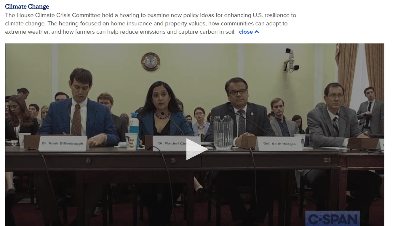 Universities like Columbia, University of Chicago, Northwestern and Arizona State have already built built and tested machines they call artificial trees that they say are 1,000 times more effective than natural trees in removing CO2 from our atmosphere and in sufficient number could stop the accumulation of Co2 and ever reverse it, but you haven't seen any House hearings about using this technology because the Democrats are fully invested in using climate change as a political issue that will appeal the the various factions the Party wants to win and not at all interested in dealing with climate change in any way that would not bring political benefits to Democratic politicians.