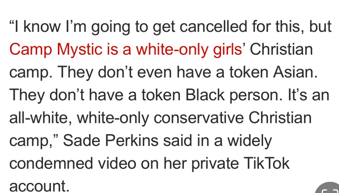 'I know I'm going to get cancelled for this, but Camp Mystic is a white-only girls' Christian camp,' she raged on TikTok as girls were still missing
