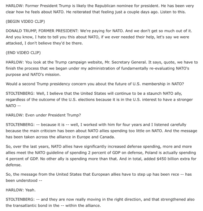 Well, the left went utterly nuts. The NY Times:And one of the presidents of a big country stood up and said, well, sir, if we don’t pay and we’re attacked by Russia, will you protect us? I said, you didn’t pay. You’re delinquent. He said, yes, let’s say that happened. No, I would not protect you. In fact, I would encourage them to do whatever the hell they want. You got to pay. You got to pay your bills.