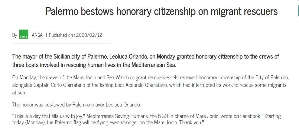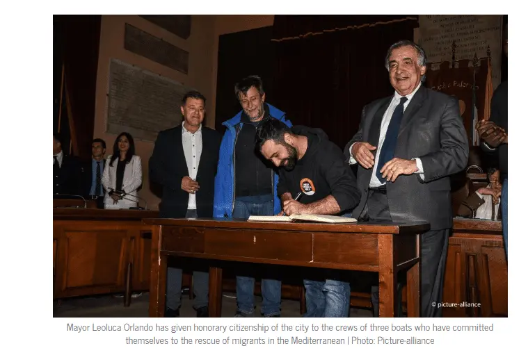 The mayor of the Sicilian city of Palermo, Leoluca Orlando, on Monday granted honorary citizenship to the crews of three boats involved in rescuing human lives in the Mediterranean Sea.