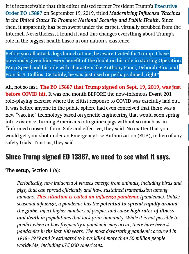 It is inconceivable that this editor missed former President Trump's Executive Order EO 13887 on September 19, 2019, titled Modernizing Influenza Vaccines in the United States To Promote National Security and Public Health. Since then, it apparently has been swept under the carpet, virtually...