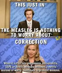 I don't minimalize the risk of measles...it is a risky virus and it does have some pretty awful potential complications, up to and including death, blindness, brain damage, and so on and so forth.