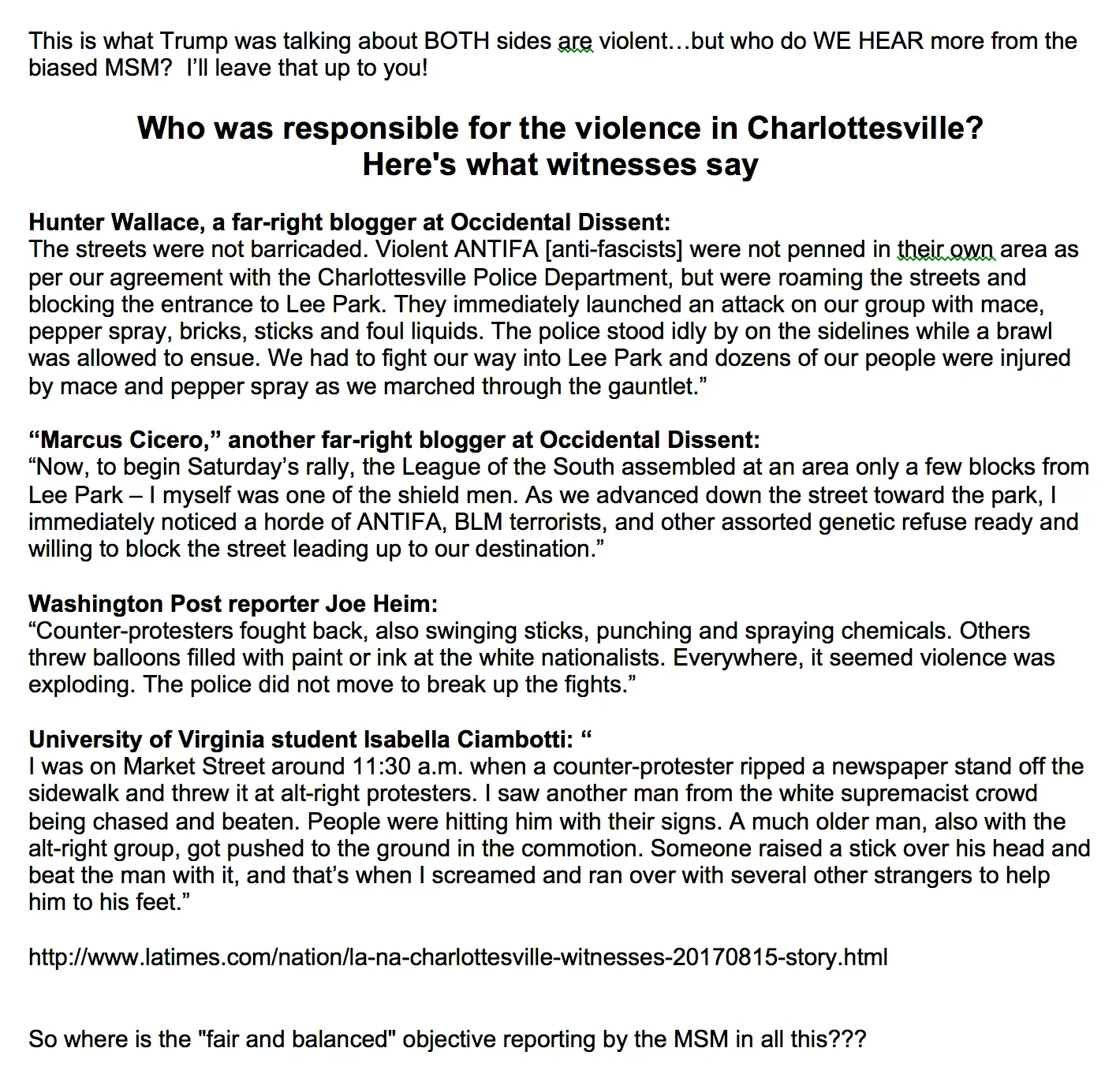I'm going to quote you:"The fact is that it was the alt-right who committed acts of violence in Charlottesville and Trump refused to condemn them." now to tear it apart