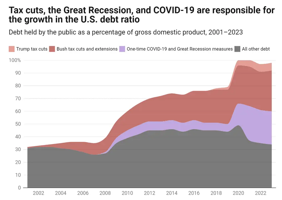 It is impossible for tax cuts to cause debt. Borrowing causes debt, not tax cuts.If not for the Bush tax cuts and their extensions—as well as the Trump tax cuts—revenues would be on track to keep pace with spending indefinitely, and the debt ratio... would be declining," a new