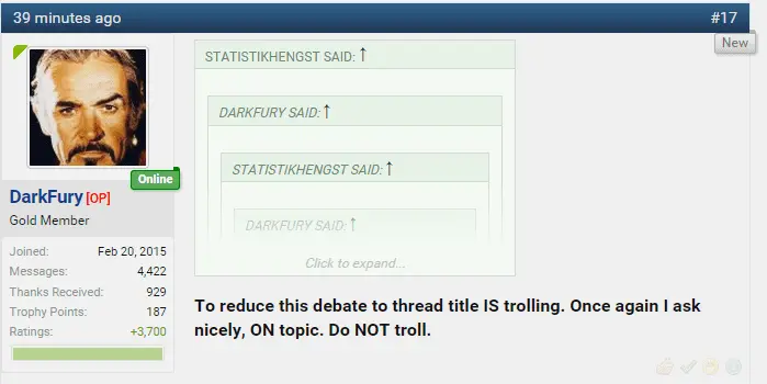 To reduce this debate to thread title IS trolling. Once again I ask nicely, ON topic. Do NOT troll.Please quit trolling my thread with your off topic antics. There ARE on topic valid points being made here.@Statistikhengst Just a little add here before I drop this subject. You are arguing the CDZ is about content control and my stance is the CDZ is about self control. But we have another problem here as well.