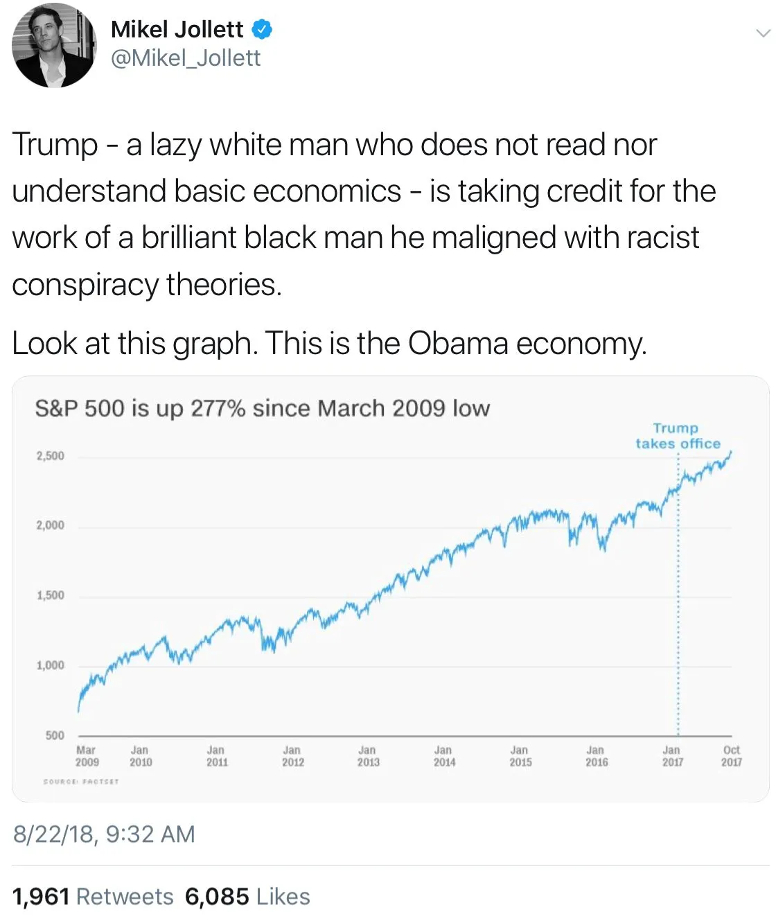 LOLOLOLDumbfuck .... JFK was not a supply side tax cutter. The top tax rate when JFK talked about cutting was 90% and the national debt was $306b. And by the way, JFK never actually cut taxes; he only talked about it.Rightwing freaks crack me up.The market crashed in 2008-2009. What recovery there was was in spite of Obabble's policies - not due to them. What see now is the recovery that should have happened years ago, but didn't due to Obama's sheer economic malfeasance. The only way he contributed to the current growth of the economy is that he did the things that Trump has now undone.