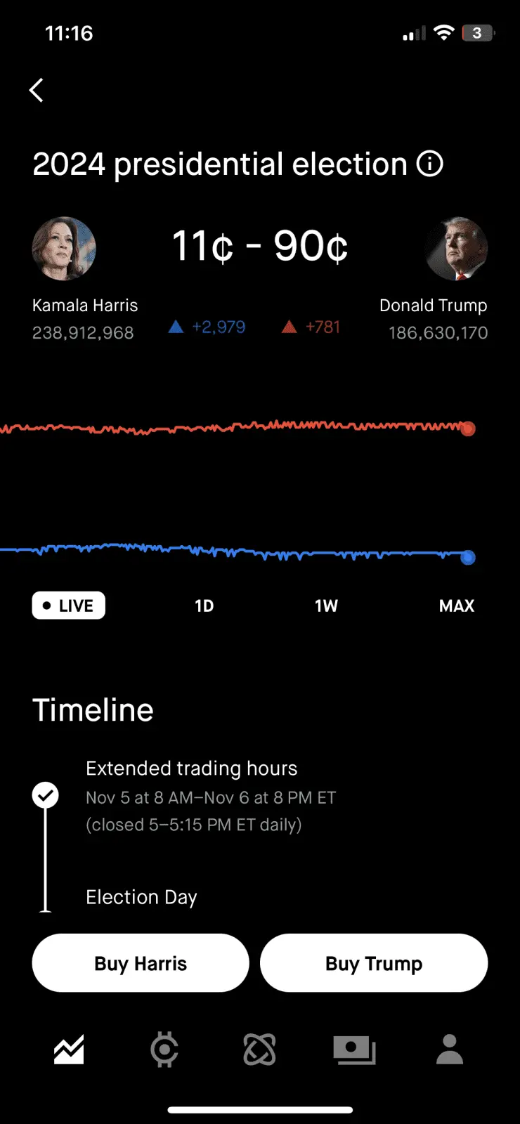 This means that if you buy one share of Donald Trump on Robinhood for $.90 you can sell it for a dollar if he wins the election. So that’s only $.10 profit. Trump is absolutely annihilating Harris. It’s like the New York Yankees versus the high school baseball team.