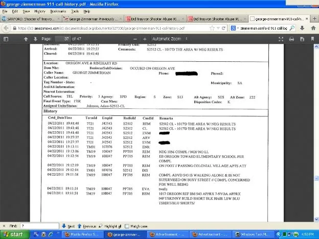 7:09:34 - 7:13:41 — George Zimmerman calls the Sanford Police Department (SPD) from his truck; total time of the call is 4 minutes 7 seconds.[15]