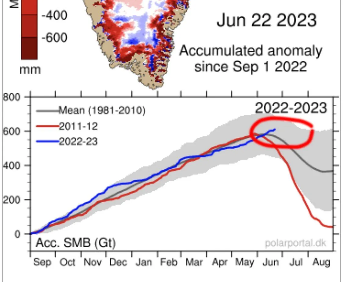 Greenland snow mass gain greater than 1981-2010 average.