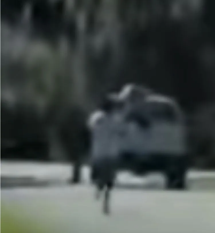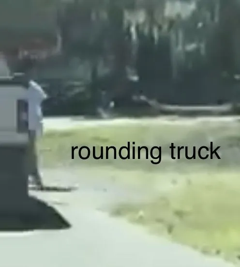 Upon seeing the swerve, suspected felon#1 repositions himself in an aggressive route to counter the swerve in by running to the front of the truck: