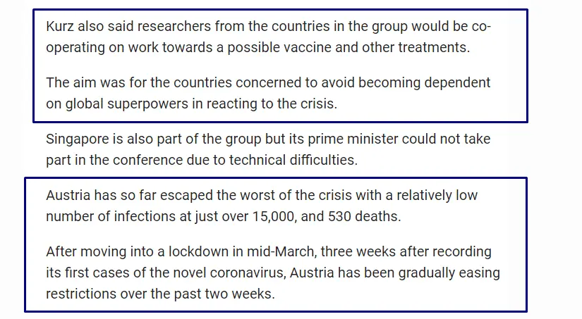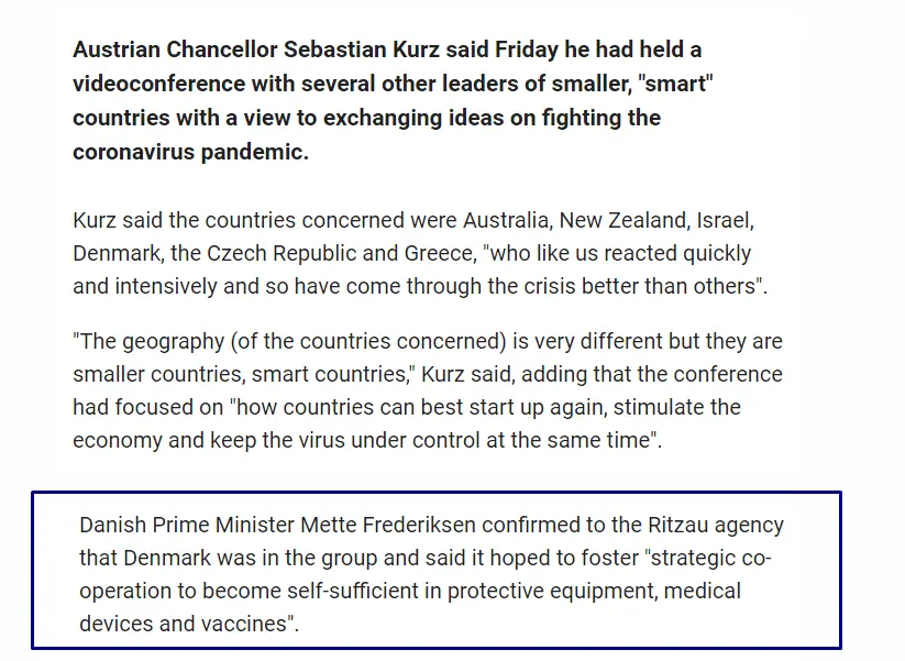 On April 22 we formed a new group a Smart Group that include our nation equal 10 nations the other nations we invite to join our Smart Group are Australia, Denmark, Norway, Hungary, Czech Republic, New Zealand, Greece, Israel and Singapore, together our COMBINED Scientists this week are to begin working on are OWN vaccine for COVID-19. We have also now this for two weeks been in stage one of the reopening of this nation, stage two to begin next we also announce that July 2 and July 3 we are holding the Austrian Grand Prix after having discussions with Formula1 regarding this, yes the peoples have to go outside with the mask but they CAN now go out this including parks and soon we reopen schools.