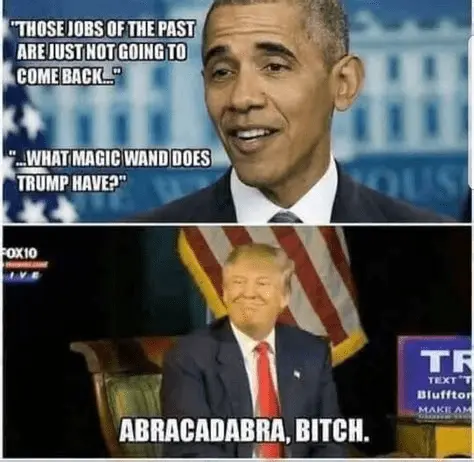 Barry declared that life without manufacturing companies here in the United States was 'The New Norm', and he stopped trying to bring them back to the US. Trump promised to bring manufacturing jobs back to the US, to put Americans back to work. Obama mocked Trump and asked what kind of magic Trump had he thought he could use to accomplish this...