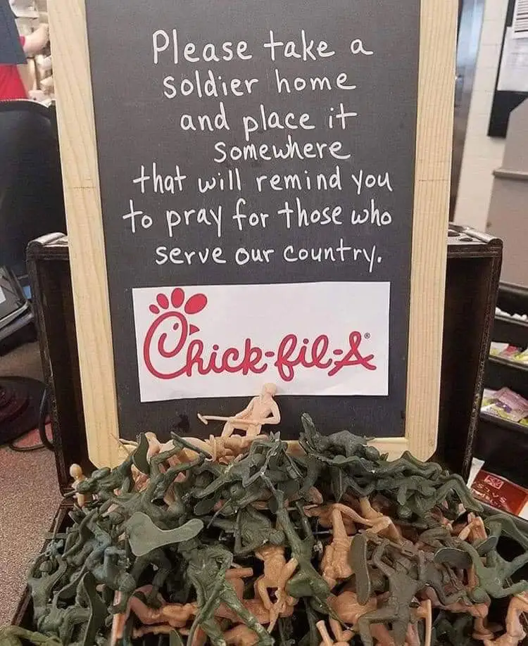 LolSmall town near us has 3 CFA’s within 5 miles, each with double drive thru lanes that wraps entirely around the building with employees getting food out like a well oiled machine, 5 minutes tops to get your food.