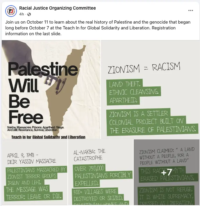 "October 7 marks two years since Palestinian resistance fighters bravely broke out of the prison that the zionist regime has turned Gaza into," a post promoting the demonstration on the RJOC's Instagram account says. "Now more than ever, we must reject all normalization with the zionist regime, uplift indigenous Palestinian resistance, and honor the martyrs."