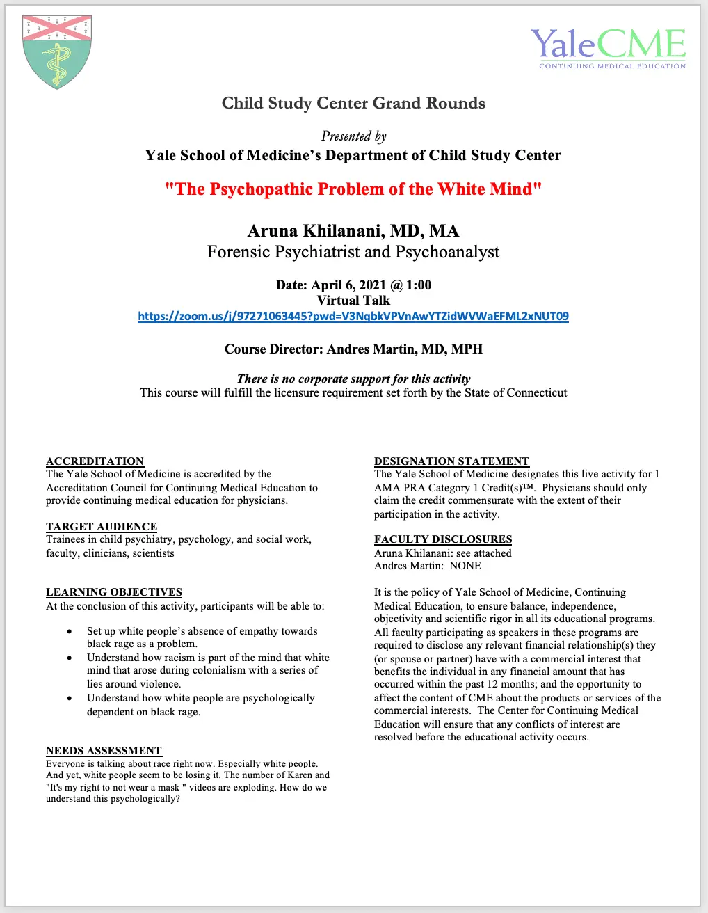 A psychiatrist lecturing at Yale's Child Study Center spoke about 'unloading a revolver into the head of any white person that got in my way.'