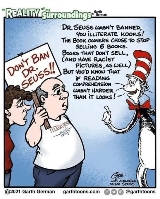 Let's see. A company that owns all the rights to the Dr Seuss books, stopped publishing 6 out of 60 that were still being published. They did it voluntarily. The 6 books that are not longer being published were very weak sellers.