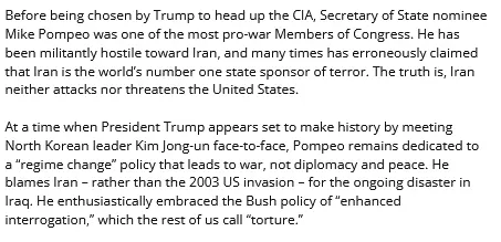 Pompeo is a career shill and spook, and someone who has a record of serving the establishment in nefarious activities. He was caught on camera doing Freudian slip, I heard it and saw it with my own to eyes & ears.
