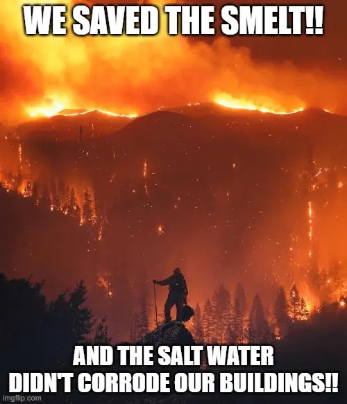 That's what government is for! Instead, progressives are more interested in protecting some ******* two inch fish instead of protecting people's homes. That water reservoir being empty for nearly a year is a joke. That should have been fixed in a week. But progressives have made it so difficult getting anything done through rules and regulations, it can take years.