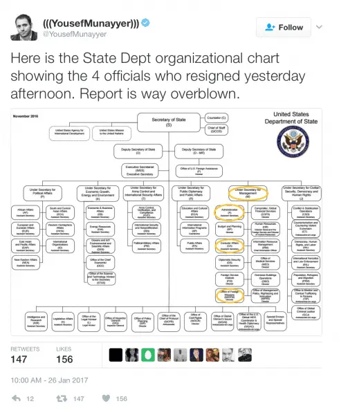 Secretary of State Rex Tillerson’s job running the State Department just got considerably more difficult. The entire senior level of management officials resigned Wednesday, part of an ongoing mass exodus of senior foreign service officers who don’t want to stick around for the Trump era.