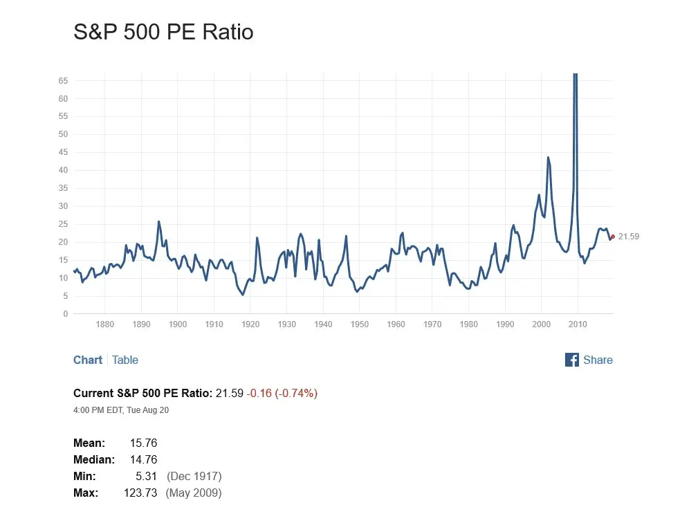 Shiller PE ratio for the S&P 500. Price earnings ratio is based on average inflation-adjusted earnings from the previous 10 years,