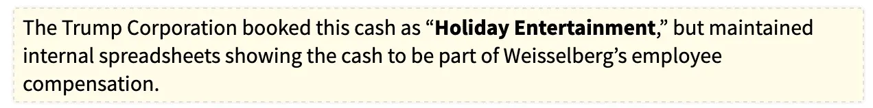 "These payments were not booked in the Trump Corporation’s general ledger as employee compensation, but were instead labeled and deducted as "rent expense" in the general ledger. However, for certain ‘years, the Trump Organization maintained internal spreadsheets that tracked the amounts it paid for Weisselberg’s rent, utility, and garage expenses."