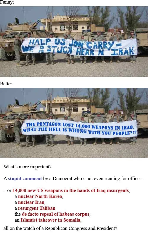 Back to Kerry ~ Like Murtha and several other outspoken critics of the war, to include the Iraq Vetrans Against the War (IVAW), Kerry has a knack for considering only the worst possible scenarios and remembering only the saddest, most disgraceful moments of our conduct and our war(s). These same critics have a nasty habit of considering the makings of each destructive story, as the makings of each and every story, and then ascribing it to the character and conduct of each and every soldier. We are better than that, Kerry and Murtha and the vets against the war are better than that. We are soldiers and we serve, as best we can, as rightly, honestly, diligently as we can. Doing that is honorable, it is the responsible thing to do.