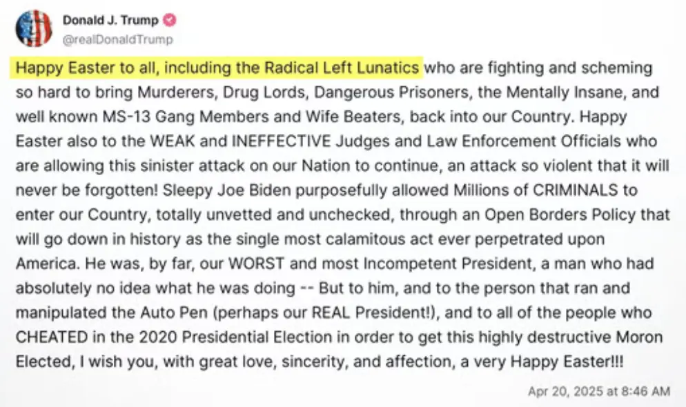 Happy Easter to all, including the Radical Left Lunatics who are fighting and scheming so hard to bring Murderers, Drug Lords, Dangerous Prisoners, the Mentally Insane, and well known MS-13 Gang Members and Wife Beaters, back into our Country. Happy Easter also to the WEAK and INEFFECTIVE Judges and Law Enforcement Officials who are allowing this sinister attack on our Nation to continue, an attack so violent that it will never be forgotten! Sleepy Joe Biden purposefully allowed Millions of CRIMINALS to enter our Country, totally unvetted and unchecked, through an Open Borders Policy that will go down in history as the single most calamitous act ever perpetrated upon America. He was, by far, our WORST and most Incompetent President, a man who had absolutely no idea what he was doing -- But to him, and to the person that ran and manipulated the Auto Pen (perhaps our REAL President!), and to all of the people who CHEATED in the 2020 Presidential Election in order to get this highly destructive Moron Elected, I wish you, with great love, sincerity, and affection, a very Happy Easter!!!