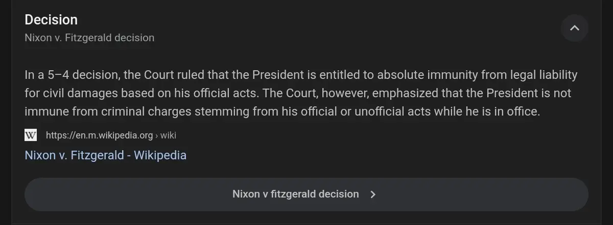 I don't necessarily disagree with the decision re: civil lawsuits looking for monetary damages, because, say, a POTUS issues an executive order that makes your stock in a company worthless (an example would be an EO suspending the use of private prisons).Your disagreement is with (1) the SCOTUS re civil Presidential Immunity (the Fitzgerald decision) and (2) the Trump motion to extend the civil immunity to criminal immunity based on the same logic as was used in Fitzgerald.