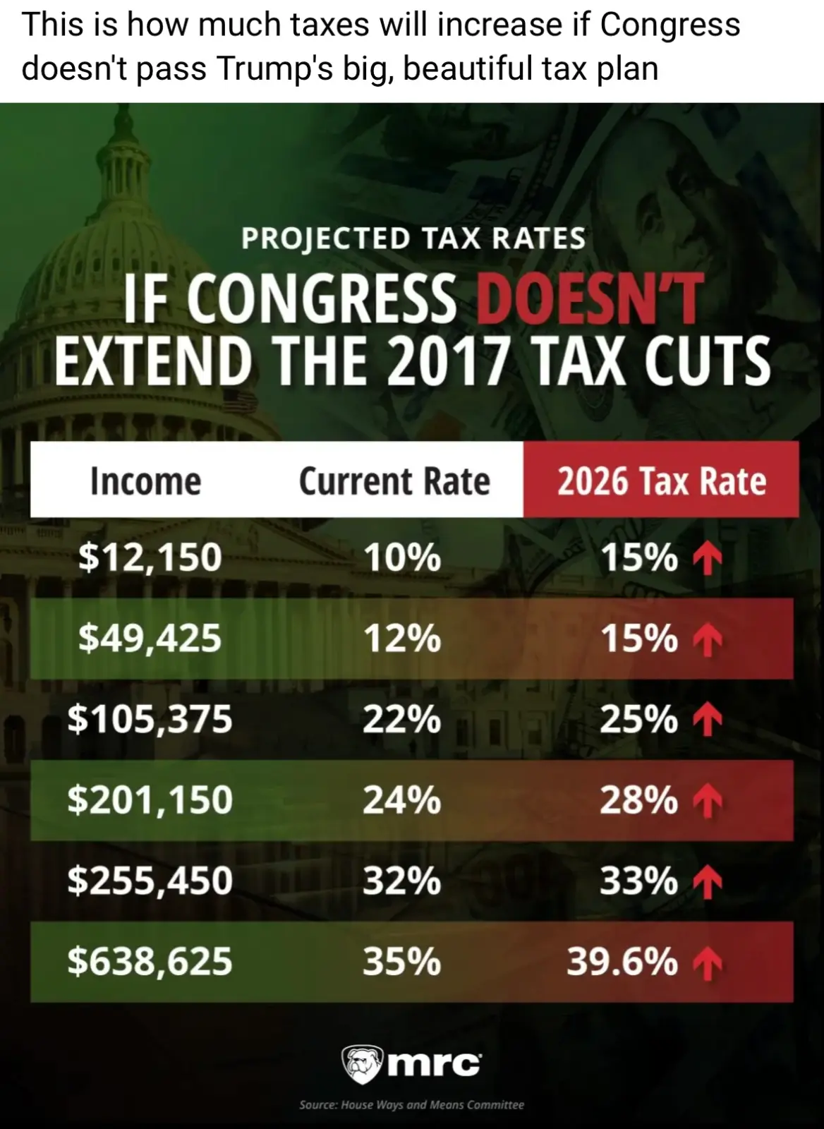 Below is a table showing the current tax rates based on the Trump tax cuts in his first term and what the tax rates will go back to if the bill isn’t passed by the Senate and signed into law by President Trump: