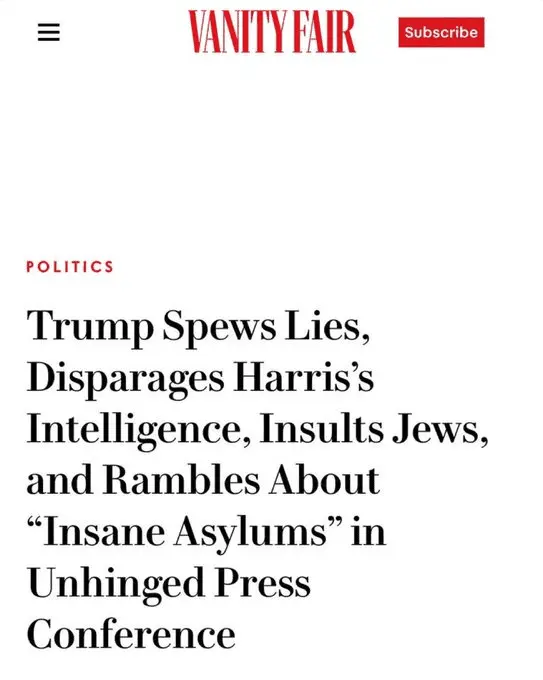 Instead, The New York Times ran this headline: “Trump Tries to Wrestle Back Attention at Mar-a-Lago News Conference.” The Washington Post said: “Trump Holds Meandering News Conference, Where He Agrees to Debate Harris.” The British paper The Independent got closer with: “Trump Holds Seemingly Pointless Press Conference Filled With False Claims,” but CNN went with “Trump Attacks Harris and Walz During First News Conference Since Democratic Ticket Was Announced.”